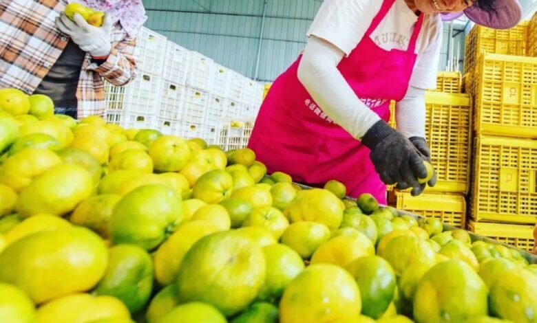 ينشغل مزارعو الفاكهة بمدينة شينيو، التابعة لمقاطعة جيانغشي الصينية، باختيار البرتقال مبكر النضج وشحنه؛ لتوريده إلى السوق.. وفي الصورة، مزارعون بالمدينة أثناء فرز البرتقال. (إيكونومي دايلي الصينية)
